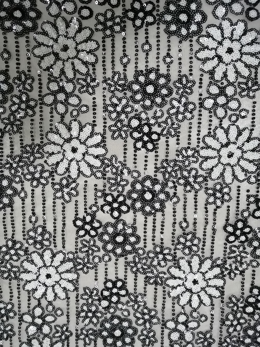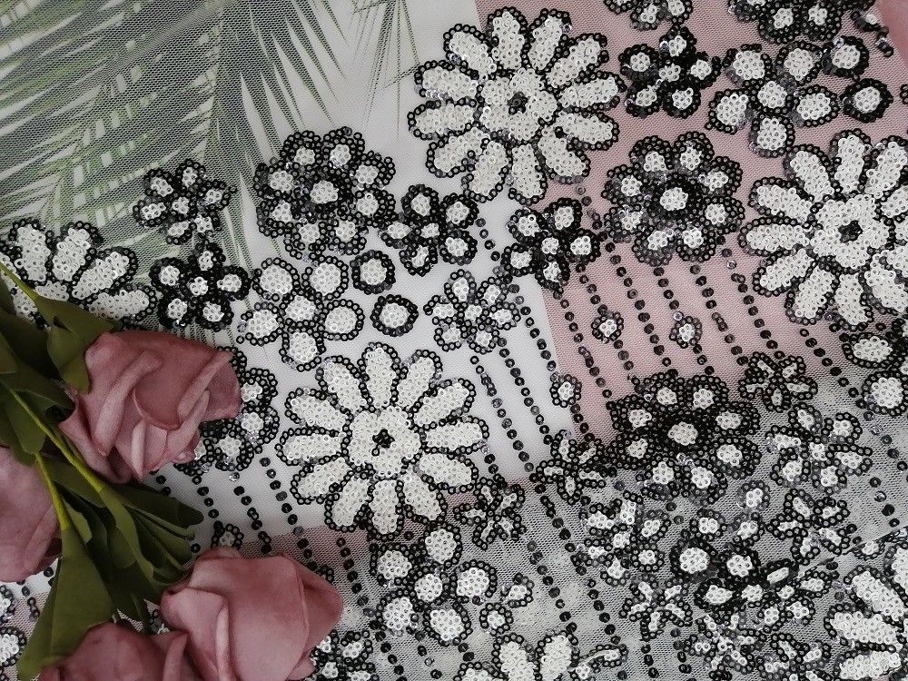 Weiße schwarze Kontrastpartei Paillette stickten Gewebe für Dress Garment Brands Abend-Kleiderdame kleines Mädchen, das Kleid für Heimtextilien ist, Vorhang, Bettwäsche-Artikel, Kleider, Hüte, Brautkleider, Blusen, Garments Dame, Tischdecke, kleine Mädchen-Kleider, umarbeiten weibliche Schuhe, Hosen, Hose, kurze Hosen, Jacken, etc.