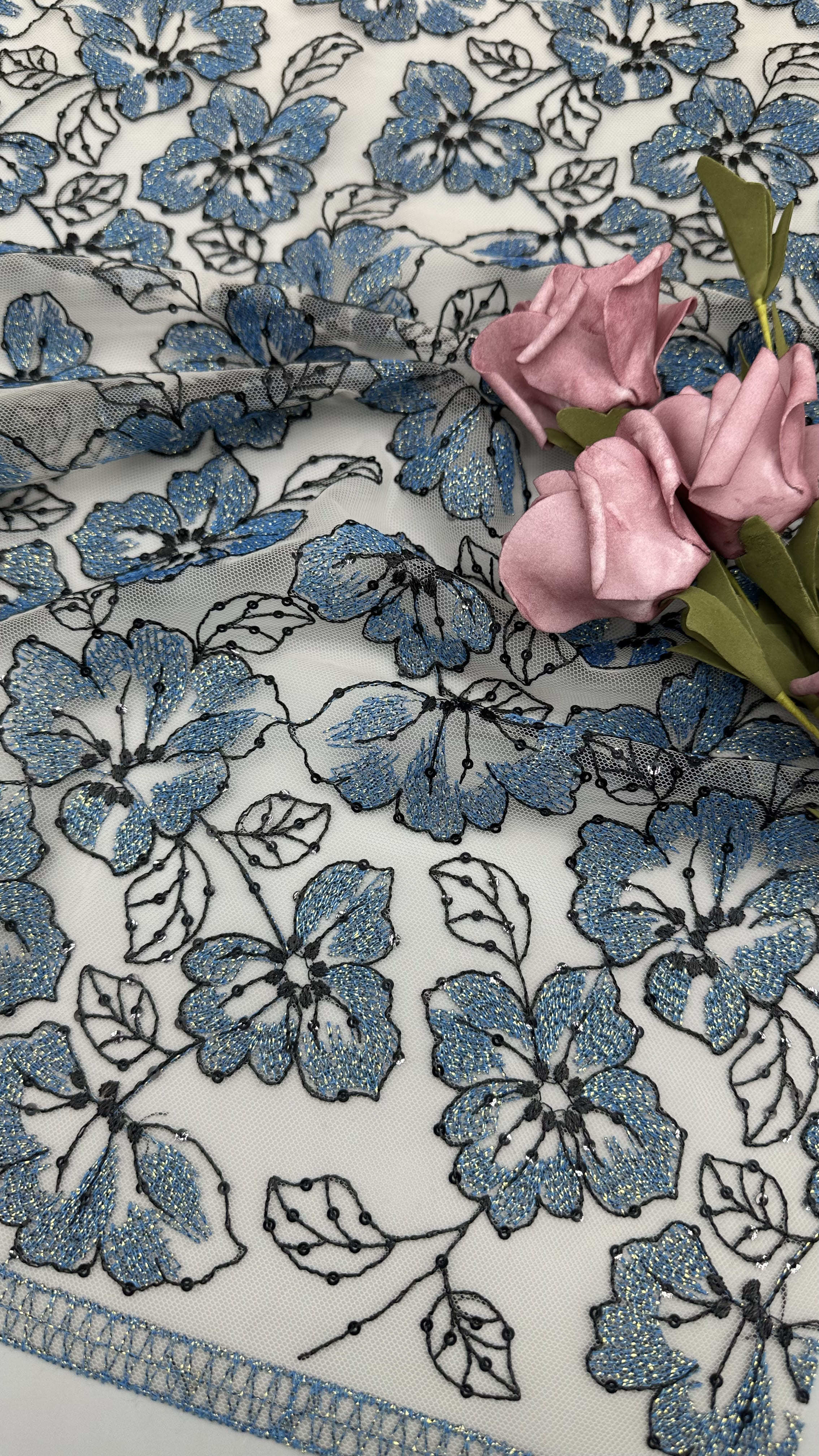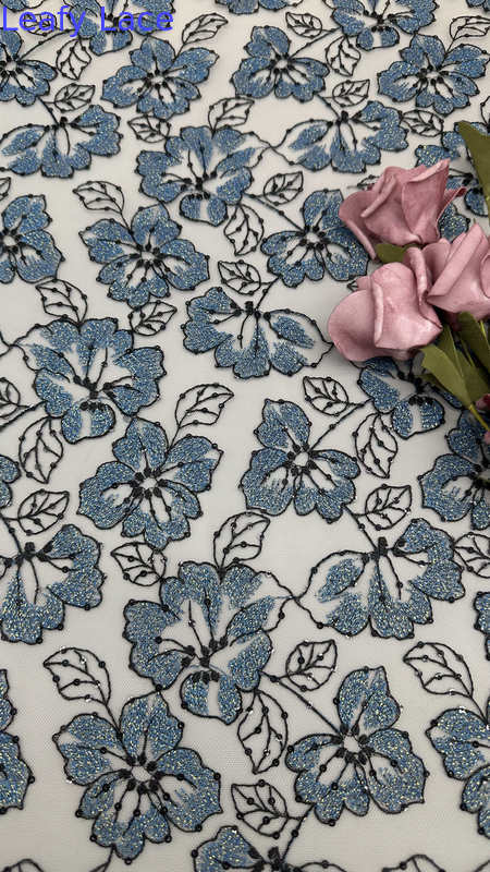 Spitzenstickerei mit zarten Blattmotiven ist eine beliebte Wahl für Hochzeits- und Partykleider und bietet Eleganz, Textur und aufwendige Details. Die Technologie hinter der Herstellung beinhaltet eine Mischung aus traditioneller Handwerkskunst und modernen Textilinnovationen.