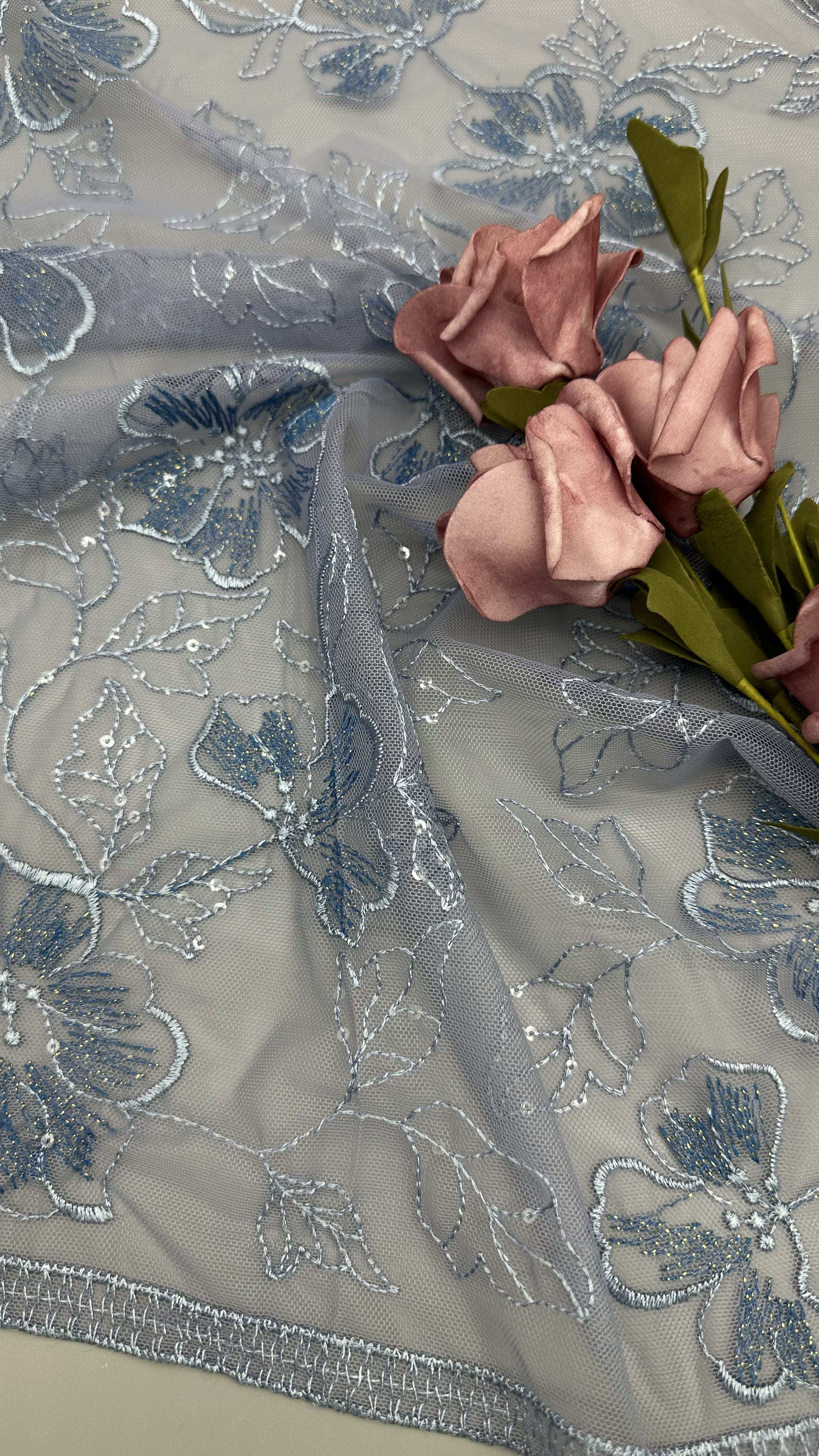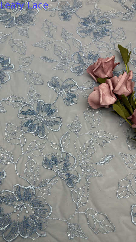 Spitze aus gestricktem Stoff mit zarten Blattmotiven ist eine beliebte Wahl für Hochzeits- und Partykleider, die Eleganz, Textur und komplizierte Details bieten.Die Technologie der Herstellung ist eine Mischung aus traditionellem Handwerk und modernen Textilinnovationen.